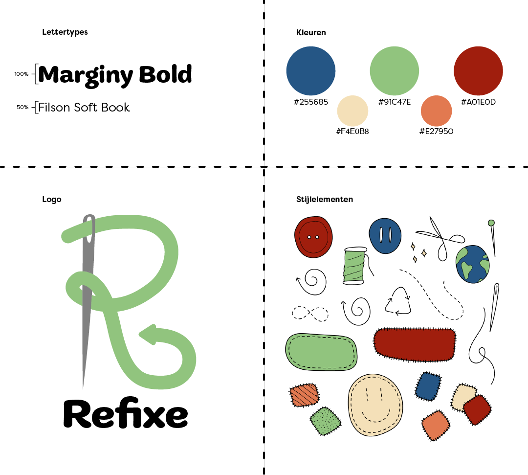 Refixe organiseert kleding upcycle workshops in Nijmegen. Hier leren ze bezoekers hoe ze hun kleding een nieuw leven kunnen geven. Refixe heeft mij gevraagd een rebranding te realiseren. Dit houdt in dat ik een nieuw logo, kleurenpalet, lettertypes en stijlelementen heb ontworpen. Deze en eerdere versies van de ontwerpen zijn te vinden op deze pagina. Woorden die passen bij de uitstraling van Refixe zijn: creatief, naaien, genderneutraal, do-it-yourself (DIY), recycle. Deze heb ik meegenomen tijdens de rebranding.
